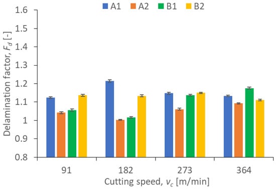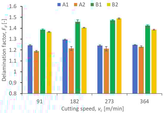 The relationship between the peel-up delamination factor and the cutting speed is presented in Figure 9. It can be observed that the lowest values of the peel-up delamination factor were obtained for A2 (Fd = 1.003) and B1 (Fd = 1.017) materials with vc = 182 m/min. For these materials, an increase in the cutting speed (in the range vc = 182 ÷ 364) caused an increase in the delamination factor value by 8.87% for A2 and by 15.43% for B1. This is an almost linear increase, and similar to the findings reported in [], where an increase in the peel-up delamination factor was observed with an increase in the cutting speed. The highest value of the peel-up delamination factor amounting to 1.214 was observed for the A1 material with vc = 182 m/min. For other cutting speeds for this material, the delamination factor values were comparable, ranging from 1.12 to 1.14. For the B2 samples, the peel-up delamination factor values were also comparable, ranging from 1.11 to 1.15. In case of the A1 material, we can clearly notice the influence of the wf ratio on the delamination factor. A1 characterized by a higher wf ratio of reinforced material causes the higher values of the peel-up delamination factor in the range of all cutting speeds.