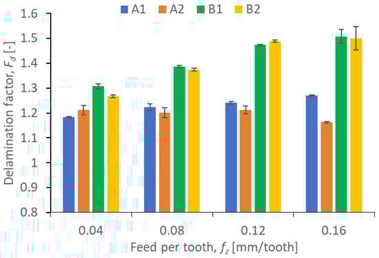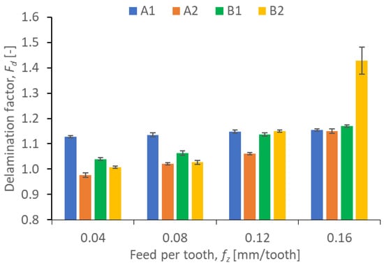 Figure 10 shows the peel-up delamination factor values in a drilling process conducted with different feeds per tooth fz and a constant cutting speed vc for different types of GFRP. The delamination factor values are the lowest for all the materials drilled with the lowest feed values (A1 = 1.13, A2 = 0.98, B1 = 1.04, B2 = 1.01). According to the diagram, the feed per tooth plays a significant role in the delamination factor for all GFRP samples, since the delamination factor increases with increasing the feed per tooth, which is consistent with the results reported in []. A comparison between the lowest and the highest feed per tooth shows that the smallest increase in the delamination factor amounting to about 1.76% is obtained for A1, then for B1 (12.49%), and for A2 (17.34%), while the highest increase is obtained for the B2 material (41.58%). The materials with the lowest increase in the delamination factor with increasing the feed per tooth are characterized by the same wf ratios of reinforced material amounting to 60%. In Figure 10, we can observe that the drilling-induced delamination rises by increasing the feed rate for most of materials. This mechanism can be related to the rise of the axial thrust force due to expanding the cross-sectional area, which also increased when the feed was increased. The higher feed rate creates more friction, which in turn, increases the delamination factor [].