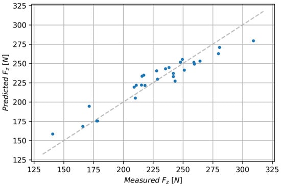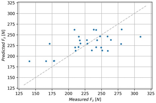To compare the performance of the models, the following metrics were used: the coefficient of determination—R2; mean absolute error (MAE); and Root-Mean-Square Error (RMSE). The linear regression model had the lowest coefficient of determination (0.352), it also achieved the highest average absolute error of 24.05 and the highest Root-Mean-Square Error of 29.92. Figure 13 shows the comparison of predicted and measured values for the discussed model.