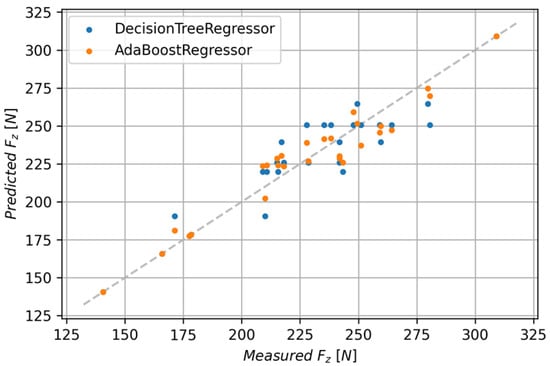 The Decision Tree Regressor model achieved an R2 score of 0.860 with an RMSE of 13.89 and MAE of 10.87. In order to improve the performance of the model, the Ada Boost algorithm was used. This allowed for an improvement of the R2 score to 0.927 with a mean absolute error of 8.37 and RMSE of 10.07. Figure 14 shows the comparison of predicted and measured values for both discussed models.