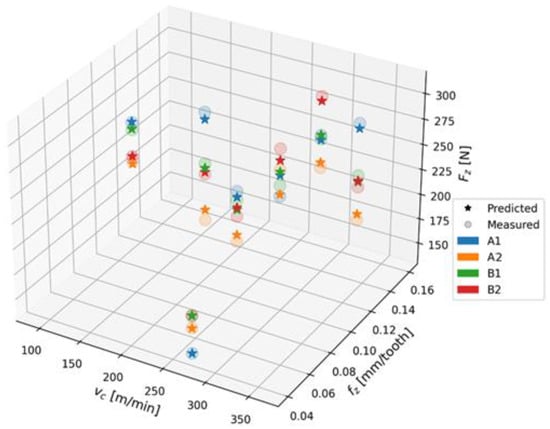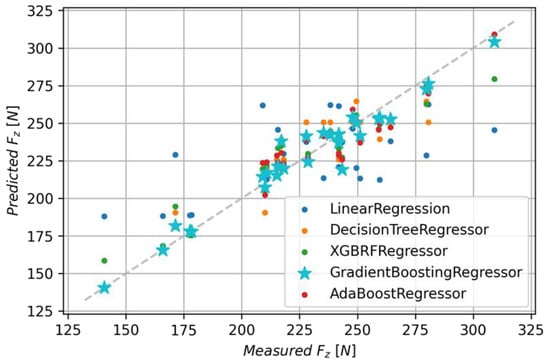 - The Gradient Boosting Regressor model has the best metric values from all analyzed models. It achieved the coefficient of determination of 0.948 with an MAE of 6.13 and RMSE of 8.46, which implies that machine learning techniques are a suitable tool for modeling the cutting force component Fz as a function of technological parameters. One of the potential applications of the Gradient Boosting Regression model in the industry is to predict the value of the Fz parameter before starting the process, which will allow for optimizing the selection of cutting conditions from the point of view of its energy consumption and minimizing delamination processes. Knowledge of Fz allows for predicting the occurrence of this phenomenon and controlling the process in such a way as to obtain the smallest possible defects in the holes made.