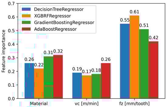 For the models presented in Table 4, whose R2 score was greater than 0.5, an analysis of the importance of features was performed. The Ada Boost Regressor model among the tested models shows the least importance for the fz parameter, which is 0.42, and the XGBRF Regressor model assigned the highest importance of 0.61 for this parameter. The Gradient Boosting Regressor model assigned an importance value of 0.51 to the fz parameter, 0.18 to the vc parameter, and an importance value of 0.31 for the material type. The importance of features for the indicated models is shown in Figure 17.