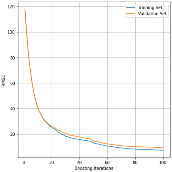 The target model, Gradient Boosting Regressor, was selected due to the largest R2 score metric and the smallest MAE and RMSE metrics. In order to check that the model does not exhibit overfitting, the RMSE value curve for a given iteration is presented in Figure 18.