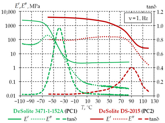 The data obtained by the authors [42] during the study of UV polymers from DSM Desotech, produced under the DeSolite trademark, were used in this article. The first layer, PC1, is made of DeSolite 3471-1-152A, and the second layer PC2 is made of DeSolite DS-2015. The experimental study was carried out on film samples on a TA Instruments DMA Q800 dynamic mechanical analyzer in the temperature range [−110; +130] °C at a harmonic disturbance frequency of 1 Hz and a heating rate of 2 °C/min. The temperature dependences for the elastic modulus E′, the loss modulus E″ and the mechanical loss tangent were obtained as a result of the study. They are presented in Figure 2.