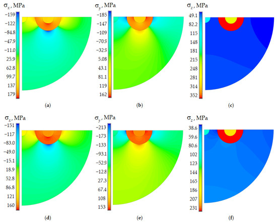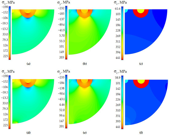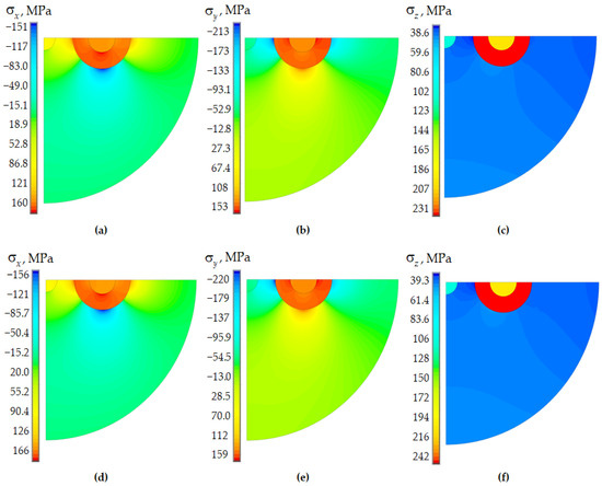 Residual stresses of Panda optical fiber (fictitious workpiece cooling start temperature of 1600 °C): (a–c) elastic body; (d–f) viscoelastic body (Anand model); (a,d) ; (b,e) ; (c,f) .