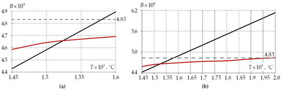 The mode birefringence’s dependence of the fiber on the cooling start temperature: (a) the fictitious temperatures region; (b) the region including the actual temperature of the cooling start; black line is elastic body; red line is viscoelastic body; the gray dashed line is an analytical solution.