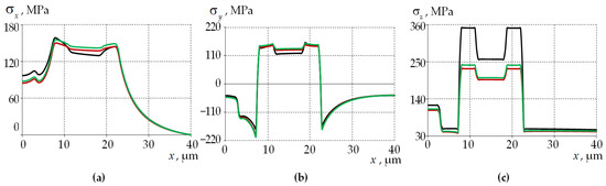 Diagrams of residual stresses along the central section of Panda fiber: (a) ; (b) ; (c) ; the black line is elastic body at a fictitious cooling start temperature of 1600 °C; the red line is viscoelastic body at a fictitious cooling start temperature of 1600 °C; and the green line is viscoelastic body at the actual cooling start temperature of 2000 °C.