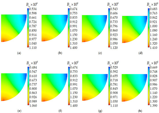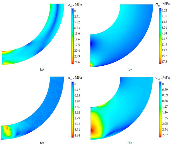 The distribution pattern of residual stress components has slight differences in the elastic and viscoelastic formulation. The levels of and differ little under different models for describing the behavior of glasses. The component’s maximum level is more than 34% higher in the elastic setting. This fact can have a significant impact on optical characteristics. The residual stresses level is consistent with the data obtained in [58].