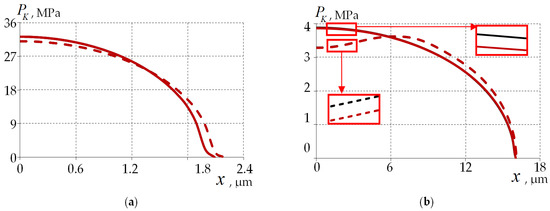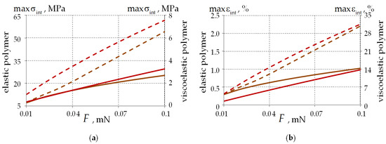 The maximum stress level in the interface zone of the quartz base and inner PC under viscoelastic behavior of polymers was: MPa, MPa and MPa. Absolute values of the stress tensor components reach: MPa, MPa and MPa at the elastic behavior of polymeric materials in the quartz–PC interface zone. The stresses along the x and y coordinates are orders of magnitude lower for the elastic behavior of PC materials than for viscoelastic behavior.