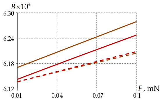 Based on the obtained data on the distribution of stresses in the workpiece, this paper found that the minimum difference in the results of the numerical solution of the problem with a significant increase in the counting time is achieved at the element size . The introduction of nonlinear models of material behavior into the computational scheme leads to an increase in computational time, including in the simulation of the iterative procedure for finding the contact surface in the fiber–half-space interface zone, and then FEM with 33.05 thousand node unknowns for discretization of quartz glass material volumes was chosen as a rational one, which corresponds to the finite element size .