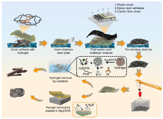 A simulation application was conducted to extract underwater artifacts utilizing a traditional epoxy multilayer material combined with PVA/TA hydrogel. A brush was used to clean the sediment near the artifacts, and the visible portion of the artifacts was covered with PVA/TA hydrogel. The artifact was fortified by inserting a steel plate at its base and enveloping it with multilayer epoxy material. Additionally, steel strips were applied around the edges to prove reinforcement. After the completion of the curing process of the epoxy resin, the artifacts can be extracted. Once the artifacts have been extracted from water, the PVA/TA hydrogel on the surface of the artifacts can be removed using an oxidation method or soaking in Na2EDTA. Figure 1 illustrates the extraction procedure.
