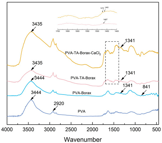 To evaluate the effectiveness of introducing TA addition, FT-IR spectroscopy was used to identify any changes in the functional group within the gel. The infrared spectra of PVA, PVA-Borax, PVA-TA-Borax, and PVA-TA-Borax-CaCl2 are shown in Figure 2. The gel composite of PVA and borax exhibited distinct peaks of boric acid and borate at 1341 cm−1 and 841 cm−1 [34]. Tannic acid has numerous catechol structures. Catechol exhibits hydrogen bonding with PVA, resulting in broadening and downshifting of the original O-H peak (3444 cm−1). The phenolic hydroxyl group is characterized by a peak at 1467 cm−1. The catechol structure is a special functional group that possesses adhesion properties. Upon the addition of Ca2+, it splits into two distinct peaks (1472 cm−1 and 1462 cm−1), suggesting the successful formation of a complexation with tannic acid [35]. The PVA/TA hydrogel has borate bonds, hydrogen bonds, and metal–phenol coordination bonds. The multi-crosslinked network of the hydrogel provides a high strength that helps consolidate the artifacts.