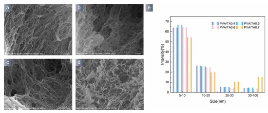 SEM image of hydrogel: (a) PVA/TA0.4; (b) PVA/TA0.5; (c) PVA/TA0.6; (d) PVA/TA0.7; (e) pore size distribution of hydrogel.