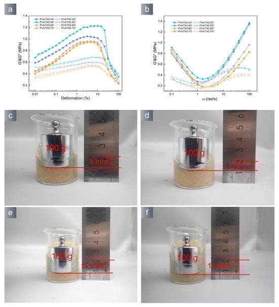 The mechanical properties of hydrogels have a direct impact on their ability to provide protection and residuals. The rheological test is effective in assessing these features. Figure 4a illustrates the stress scanning curves of PVA/TA hydrogels with varying amounts of tannic acid. It is observed that within the low-stress range (0.01~1%), the hydrogel’s energy storage modulus gradually increases with the applied stress increase. In the linear viscoelastic range of the hydrogel, the energy storage modulus reaches the maximum and tends to stabilize. The PVA/TA0.5 hydrogel has the highest energy storage modulus, and the internal bond of the hydrogel is saturated. Figure 4b exhibits the frequency scan curves of each group of PVA/TA hydrogels. The frequency scan curves of the hydrogels have a quadratic function shape. This result indicates that the PVA/TA hydrogels conduct dynamic crosslinking [36,37]. Applying pressure to the hydrogel can effectively demonstrate the hydrogel’s ability to provide cushioning (Figure 4c–f). The PVA/TA0.5 hydrogel possesses the highest resistance to external pressures among all the hydrogels.