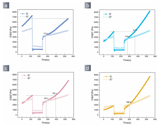 The PVA/TA hydrogel exhibited borate bonds, metal–phenol coordination bonds, and hydrogen bonds. External pressures can cause the hydrogel’s dynamic bonds to reconstruct, leading to self-healing. The rheometer results of the hydrogel are shown in Figure 5. The hydrogel demonstrated a gel–sol–gel transition in response to changes in stress. The PVA/TA0.4 restoration reached 91.6% of its initial condition after 5 min, demonstrating a remarkable self-repairing capability. The PVA/TA0.5 sol–gel exhibits a transition time of 33 s and is capable of returning to its initial condition within 132 s. The hydrogel’s network can be completely restored by dynamic cross-linking bonds. Hydrogels exhibit exceptional flexibility and the ability to self-heal, making them ideal for safeguarding artifacts of various forms during extraction and transportation.