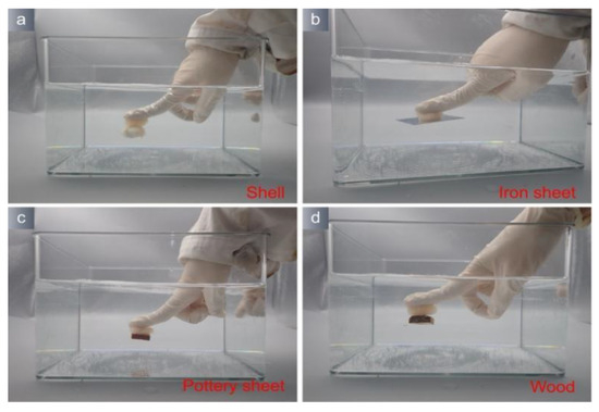 Shells, waterlogged woods, iron sheets, and ceramic mockups were selected as objects and placed in a 3.6% saline environment, and hydrogels were adhered to the surface and gently pressed for 10 s to observe the adhesion of hydrogels to different substrates.