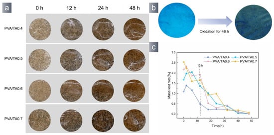 Catechol is prone to oxidation in the atmosphere, leading to a decrease in the hydrogel’s adhesion. Figure 7c illustrates a gradual decrease in the adhesive properties of the PVA/TA hydrogel as time progresses. The hydrogel exhibited a dynamic color alteration (Figure 7a), changing from light yellow to dark brown. The fluorescence of the hydrogel was quenched (Figure 7b). The hypoxic conditions in the underwater environment might impede the degradation and detachment of the hydrogel throughout its use.
