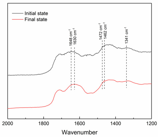 FT-IR was used to explore the adhesion decrease process of the hydrogels (Figure 8). The telescopic vibration peak of the benzene ring in the pristine hydrogel is observed at 1648 cm−1. This peak has a blue-shift to 1630 cm−1. This shift is attributed to the conjugation between the C=O group and the aromatic ring, resulting in a decrease in the frequency of the characteristic peak of the benzene ring. Additionally, the catechol structure undergoes oxidation to form benzoquinone [38]. In addition, the characteristic peaks corresponding to the metal–phenol coordination bonds in the hydrogel (at 1472 cm−1, 1462 cm−1) and the characteristic peak of the borate bond at 1341 cm−1 remained unchanged. Only catechol underwent oxidation to yield benzoquinone within the hydrogel. Thus, by utilizing the hydrogel’s oxidation response property, it becomes feasible to eliminate the hydrogel from the surface of extracted underwater artifacts. This property fulfills the requirements of temporary underwater consolidation materials.