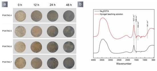 The PVA/TA hydrogel network consists of borate bonds, metal–phenol coordination bonds, and hydrogen bonds. Borate bonds and metal–phenol coordination bonds exhibit high sensitivity to fluctuations in pH value. The tests employed a Na2EDTA solution to provide an acidic environment to eliminate the hydrogel. After a period of 48 h, the hydrogel exhibits a transformation from a yellowish gel state to a macromolecular sol. The dissolution of tannic acid in the hydrogel resulted in the solution gaining a light yellow color (Figure 9a). The Na2EDTA stock solution and the leach solution were characterized via FT-IR spectroscopy. The results are presented in Figure 9b. The Na2EDTA solution exhibited antisymmetric stretching vibration peaks and symmetric stretching vibration peaks of the carboxyl group of COO-Na at 1637 cm−1 and 1489 cm−1. Part of the EDTA present in the leaching solution formed complexes with the calcium ions in the hydrogel, resulting in the appearance of a symmetric stretching vibration peak at 1404 cm−1 [39]. The B-O bond in the EDTA compound exhibited a distinct peak at a wavenumber of 841 cm−1. The PVA/TA hydrogel displaced the metal–phenol coordination bond and borate ester bond in the Na2EDTA solution, leading to the disintegration of the hydrogel and its reversion to a sol state. Therefore, immersing extracted underwater artifacts in Na2EDTA solution can effectively remove surface hydrogel.