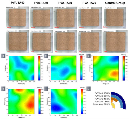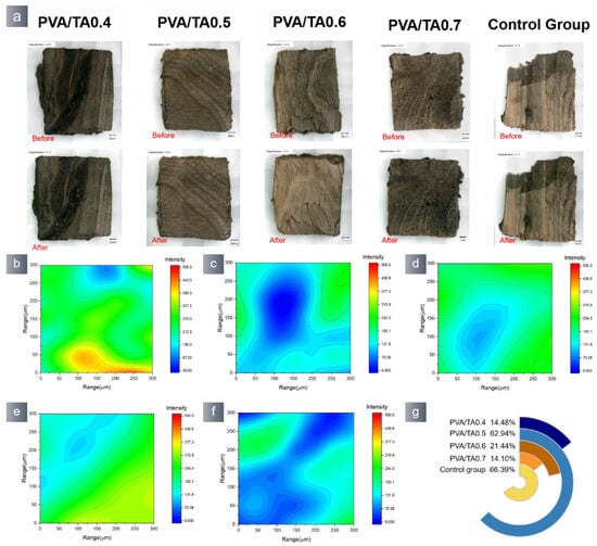 (a) Morphological changes in wood before and hydrogel removal by oxidation. Used wood maps obtained from the 1341 spectra that make up the FTIR map: (b) PVA/TA0.4; (c) PVA/TA0.5; (d) PVA/TA0.6; (e) PVA/TA0.7; (f) control group, and (g) measuring the blue area in each FTIR map.