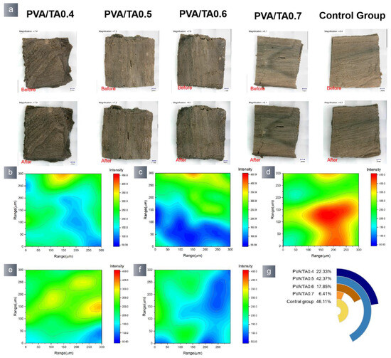 (a) Morphological changes in pottery before and hydrogel removal by oxidation used pottery maps obtained from the 1341 spectra that make up the FTIR map: (b) PVA/TA0.4; (c) PVA/TA0.5; (d) PVA/TA0.6; (e) PVA/TA0.7; (f) control group, and (g) measuring the blue area in each FTIR map.
