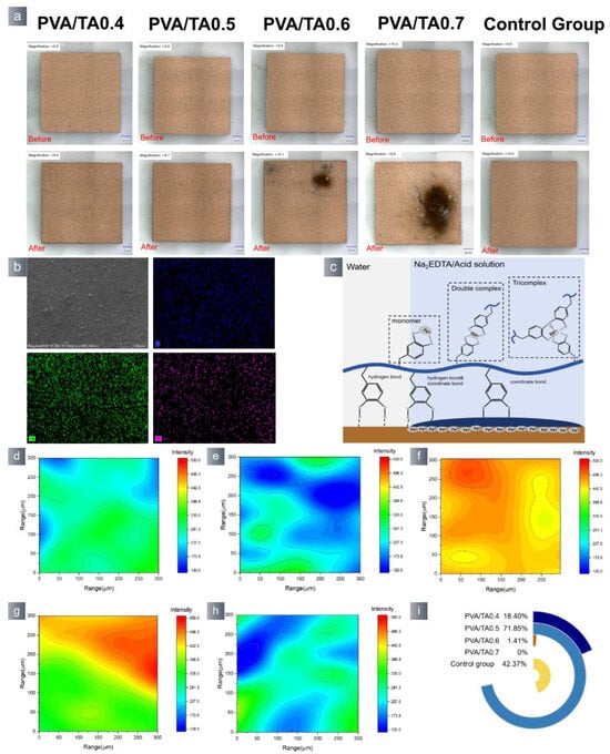 (a) Morphological changes in pottery before and hydrogel removal by soaking in 10 mmol Na2EDTA solution. (b) The SEM-EDS sweep of black sediment. (c) Black sediment formation mechanism used pottery maps obtained from the 1341 spectra that make up the FTIR map: (d) PVA/TA0.4; (e) PVA/TA0.5; (f) PVA/TA0.6; (g) PVA/TA0.7; (h) control group, and (i) measuring the blue area in each FTIR map.