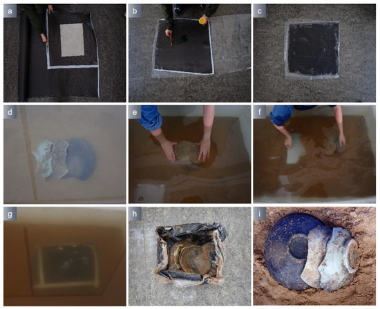 Hydrogel and epoxy resin multilayer material were used to extract porcelain (14 °C). (a) Cutted carbon fiber sheet; (b) Applied the epoxy resin to the carbon fiber sheet; (c) Epoxy resin multilayer material; (d) Buried marine ceramics in water; (e) Adhered hydrogel to marine ceramics; (f) Inserted the base plate; (g) Wrapped epoxy multilayer materials; (h) Removed the base plate; (i) Marine ceramics after hydrogel removal.