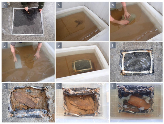 Hydrogel and epoxy resin multilayer material were used to extract wood (14 °C). (a) Applied the epoxy resin to the carbon fiber sheet; (b) Buried waterlogged wooden artifacts in water; (c) Adhered hydrogel to waterlogged wooden artifacts; (d) Inserted the base plate; (e) Wrapped epoxy multilayer materials; (f) Lifted the package out of the water (g) Removed the base plate; (h) soaked in Na2EDTA to remove hydrogel; (i) waterlogged wooden artifacts after hydrogel removal.