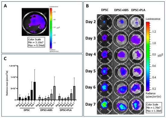Adhesion and proliferation evaluation. (A) Confirmation of the expression of the luciferase enzyme by DPSCs. The light signal emitted by DPSCs during the degradation of D-luciferin by the luciferase enzyme present in the cells is represented by the color blue. (B) Evaluation of DPSCs cultured on the plate well (DPSC) and on ABS (DPSC+ABS) and PLA (DPSC+PLA) polymers. Representative pseudo-colored images of the bioluminescent signal emitted by cells. Monitoring was carried out between the 2nd and 7th day of cultivation. Comparison with the color scale allows us to confirm the increase in light signal emission over the days of cultivation, proving cell proliferation. For images (A,B): the side scale indicates the amount of light signal measured in the unit of measurement photons per second per square centimeter per steradian [p/s/cm2/sr]. (C) Quantification of the bioluminescent signal emitted by DPSC adhered to different growth surfaces. Unit of measurement photons per second per square centimeter per steradian [p/s/cm2/sr] (n = 9).
