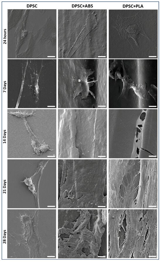 Scanning electron microscopy (SEM) allows analyzing cell morphology and adhesion and the microstructural characteristics of the polymer surface. The DPSCs were observed after 24 h, 7, 14, 21, and 28 days of cultivation on the polymers. For each moment of analysis, the samples composed of DPSC, DPSC+ABS, and DPSC+PLA were fixed in 1.5 mL of glutaraldehyde solution (Electron Microscopy Sciences, Hatfield, PA, USA) in sodium cacodylate buffer (Sigma-Aldrich, St. Louis, MO, USA) and sucrose (Biotec-Labmaster, Pinhais, Brazil)) for 45 min. The fixing solution was removed, and the sample was washed with sodium cacodylate buffer and sucrose for 10 min. After fixation, the samples were dehydrated in a series of 10-min incubations with ethanol solutions (35%, 50%, 70%, 100%) (Biotec-Labmaster, Pinhais, Brazil) followed by Hexamethyldisilazane (HMDS) (Sigma-Aldrich, St. Louis, MO, USA) 100% for the same time. After drying, the metallization in gold was performed (QUORUM—Q150R ES), where they were covered with a thin gold deposition for SEM analysis (SEM Vega3, Tescan, Brno, Czech Republic).