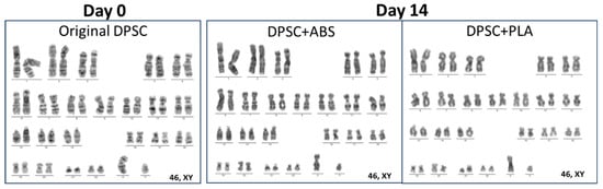 Representative karyograms: original DPSCs (day 0) and after 14 days of cultivation with medium conditioned in ABS (group DPSC+ABS) and PLA (group DPSC+PLA), presenting normal karyotypes under different time points.