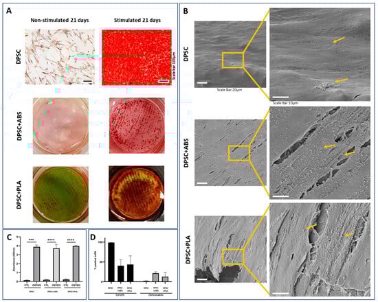 Biomaterials, including a broad range of polymers, are engineered to interact safely and beneficially with biological systems and are pivotal in numerous biomedical applications such as dental and bone tissue regeneration [,]. Loosening or poor bone remodeling of implants may occur, making it important to search for materials that allow the preparation of structures even more similar to the natural bone matrix, with polymers being excellent candidates for this application []. Selecting the appropriate polymer for therapeutic use with DPSCs is an intricate process, requiring the material to be analogous to the physiological and biochemical properties of the tissue it is intended to replace and, importantly, to exhibit high biocompatibility. However, this selection process presents challenges, like the body’s potential adverse responses and managing the suitable degradation rates. Material science, technology, and biology advancements promise to bring forth increasingly effective and innovative polymers []. Hence, the synergy between DPSCs and polymers holds immense potential, opening new roads in regenerative medicine and tissue engineering. Indeed, DPSCs were shown to be biocompatible with various polymers such as Chitosan polymeric blends of polybutadiene (PB), poly-ε-caprolactone (PCL)/poly (rotaxane), poly(lactide-co-caprolactone) (PLCL), and several others [,,,]. Polylactic Acid (PLA) and Acrylonitrile–Butadiene–Styrene (ABS) are promising in this broad spectrum of polymers, each with their unique characteristics and potential advantages for use in conjunction with DPSCs.
