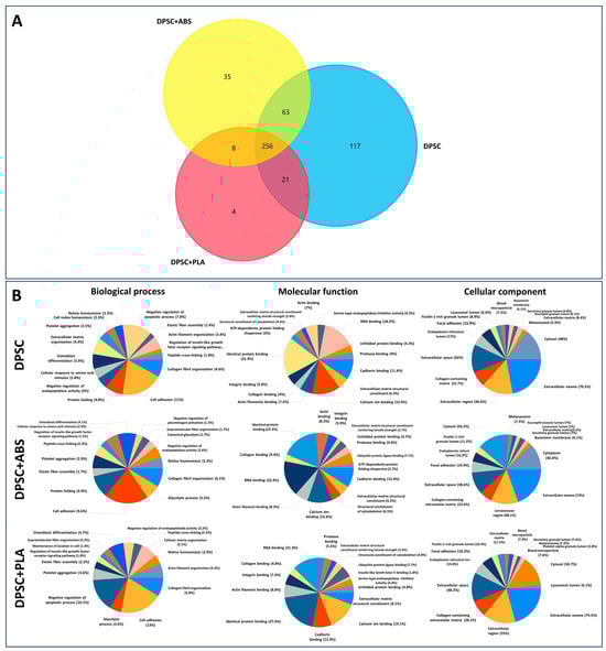 Protein identification and functional enrichment analysis of the secretome. (A) Venn diagram of the proteins identified in the three conditions. (B) Gene ontology enrichment analysis of total proteins identified in the secretome of cells cultivated on PLA, ABS, and control showing the most enriched terms for molecular function, biological process, and cellular components. The pie chart shows the 15 most significantly enriched terms in each category (p < 0.01). GO analysis was conducted with Funrich software (version 3.1.3).