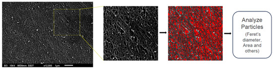 Pore size analysis using ImageJ software. The original image was used to define the scale. Then, a region of the image was selected and the threshold was defined. Finally, the particles were analyzed and information on pore size was obtained (Feret’s diameter and area).