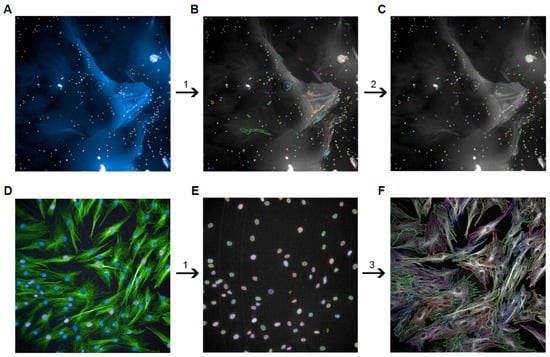 To assess alterations in hASC morphology, 1.5 × 103 cells/well were plated on TCPs or PURA and cultured for 5 days. After this period, cells were fixed with 4% PFA and incubated with rabbit anti-β-Tubulin antibodies (ab15568, Abcam, Cambridge, UK diluted in 1% PBS/BSA (bovine serum albumin) and 0.5% Triton X-100, overnight at 4 °C under gentle agitation. The samples were washed thrice for 5 min with 1% BSA/PBS and 0.1% Triton X-100 solution. Then, anti-rabbit Alexa Fluor 488 (A21206; Invitrogen Life Technologies®, Carlsbad, CA, USA) secondary antibodies diluted with 1% PBS/BSA and 0.1% Triton X-100 solution were added to the samples. After incubation for 3 h, samples were washed again and stained with DAPI. Cell imaging was performed using the confocal microscope of an Operetta HTS imaging system (PerkinElmer, Waltham, MA, USA) at 20× magnification. Cell morphology analysis was performed using the Harmony 4.8 software (PerkinElmer, Waltham, MA, USA). The analysis sequence for calculating cell area (morphology analysis) in the software was as follows: Input image (original image) (Figure 2D) >> Find nuclei (Figure 2E) >> Select population (to remove the objects on image borders) >> Find cytoplasm (based on the methods available) (Figure 2F) >> Calculate morphology properties (area, width, length, and others) >> Define results (number of objects, cell area, and others). In addition, to better understand cell behavior on PURA, after hASC plating on the coating, images of the cell plates were taken every 5 days over a total of 20 days using Leica DM IL LED (Leica Microsystems, Wetzlar, Germany).