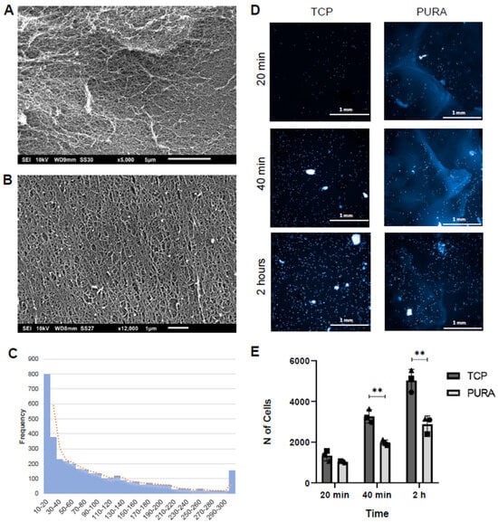 The PURA nanotopography was characterized using SEM, as shown in Figure 3A,B. Further inspection of the hydrogel layer confirmed that PURA comprises a highly porous, compact nanofibrous array with pore diameters ranging from 10 to 200 nm (Figure 3B,C). The hydrogel layer showed no signs of damage or degradation after 5 and 10 days. Then, we evaluated whether PURA could affect hASC adhesion. After 20 min of incubation, both TCPs and PURA had the same number of cells adhered; however, as time progressed, both at 40 min and 2 h of incubation, PURA had about half the number of cells adhered in comparison to TCP (Figure 3D,E), showing that cells adhered slower to PURA compared to TCPs.