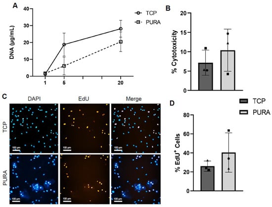Considering the differences in cell growth dynamics in PURA compared to TCPs—mainly after 5 days of culture—we investigated whether PURA affected the viability or proliferation capacity of hASCs. The PURA treatment had no cytotoxic effect on the cells (Figure 4B), as the percentages of cell death were similar between TCPs (7.15% ± 3.25) and PURA (10.39% ± 5.45). Representative images of the EdU assay showed that both culture conditions allow the proliferation of hASCs, which was confirmed after quantification (Figure 4C,D). Quantitative analysis revealed that Puramatrix™ did not affect cell proliferation, with the percentage of EdU-positive cells in PURA being comparable to that in TCPs on day 5 of culturing (TCP: 34.40% ± 10.06; PURA: 40.41 ± 20.70). Combined, these results suggest that the cell population undergoes adaptation to the Puramatrix™ substrate in the first 5 days of culturing.
