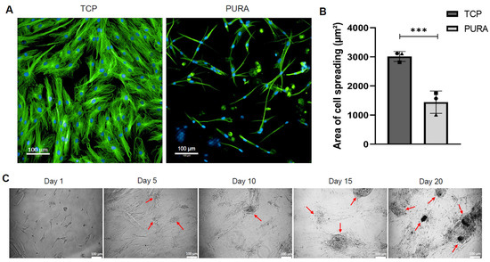 One aspect that drew attention after 5 days in culture was the apparent change in cell morphology. When cells were stained with β-tubulin, it was observed that hASCs in PURA exhibited a variety of morphologies and that the interaction between the cells and the Puramatrix™ coating also resulted in the formation of cell aggregates (Figure 5A). Quantitative analysis of the cell-spreading area showed that cells that adhered to PURA were half the size of cells on TCPs (Figure 5B). Considering the importance of cell aggregation in the initial stages of cartilage formation, we further investigate the establishment of these aggregates on the Puramatrix™. The images acquired over 20 days of culturing showed hASC growth and formed cell aggregates in PURA, with an increase in cell confluence and the number and size of aggregates throughout the experiment (Figure 5C).