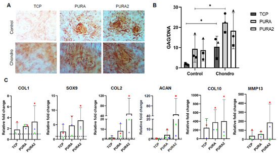 After cell differentiation induction, Safranin O staining was performed to qualitatively assess the deposition of sulfated GAGs. hASCs cultured in TCPs in expansion media (control) were weakly stained (Figure 7A), while cell aggregates present in PURA and PURA2 appeared a little more stained. Under chondrogenic induction, the cell aggregates present in both PURA and PURA2 were highly stained—more than in TCP—indicating significant production and accumulation of sulfated GAGs (Figure 7A). The quantification of GAG production revealed a tendency of higher GAG deposition by cells cultured on PURA and PURA2 in comparison to those cultured in TCPs (Figure 7B), both by cells in expansion media (control) and chondrogenic media (chondro).