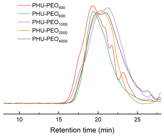 The route of synthesis for the PHU-PEO-PSSQ networks is shown in Scheme 1. First, linear polyhydroxyurethane-poly(ethylene oxide) (PHU-PEO) multiblock copolymers were synthesized via the step-growth polymerization of B6CC with the equimolar NH2-PEO-NH2; the latter were synthesized via a multi-step reaction with poly(ethylene glycol)s (PEGs) as the starting materials [51], as detailed in SI. In this work, the PEGs were used with the molecular weights of Mn = 400, 600, 1000, 2000 and 4000 Da, respectively; the PHU-PEO multiblock copolymers were thus synthesized with variable contents of PEO. Through the reaction of the side hydroxyl group of PHU with isocyanate group of 3-isocyanatopropyltriethoxysilane (IPTS), triethoxysilane groups were grafted onto the main chains of PHU-PEO copolymers. The hydrolysis and condensation of these triethoxysilane groups led to the generation of PHU-PEO-PSSQ networks, in which polysilsesquioxane (PSSQ) segments were the crosslinking links. Representatively displayed in Figure 1 are the 1H NMR spectra of B6CC, NH2-PEO1000-NH2 and PHU-PEO1000. For B6CC, the resonance signals at 4.16~4.72, 3.50, and 1.48 ppm were attributed to the protons of methylene groups, whereas 0.89 ppm was attributed to the protons of methyl groups. For NH2-PEO1000-NH2, the resonance signals at 2.82 and 3.61 ppm were attributed to the protons of methylene groups of the repeating units. The former corresponds to the protons of methylene connected to amino groups whereas the latter to those in the middle of PEO chains. After the polymerization with B6CC, the signals of resonance at 4.22, 3.95 and 3.22 ppm were displayed, and assigned to the protons of methylene groups from the ring opening of B6CC. The PHU-PEO multiblock copolymers were further subjected to gel permeation chromatography (GPC). All of the samples displayed the sufficiently high molecular weights of Mn = 22,100~32,400 Da with Mw/Mn = 1.32~1.53 (Figure 2). The 1H NMR and GPC results indicate that the linear PHU-PEO multiblock copolymers were successfully synthesized.