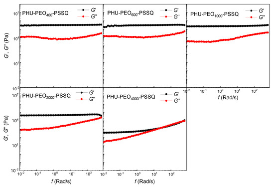 The crosslinking of the PHU-PEO multiblock copolymers was studied by rheological analysis; the rheological measurements were conducted at 60 °C, a temperature above the melting points of PEO and the glass transition temperatures (Tg’s) of the networks. In this work, the small amplitude oscillation shear (SAOS) measurements were performed; the rheological data are presented in Figure S3. For all of the linear PHU-PEO copolymers, the dynamic shear moduli (G′ and G″) increased with the shear frequency rising, indicating that these linear copolymers displayed typical viscoelastic properties. It is seen that the G″ curves were above the G′ curves. This observation indicates that these PHU-PEO multiblock copolymers behaved as the viscoelastic liquids. Notably, while 3-isocyanatopropyltriethoxysilane was introduced and the hydrolysis and condensation were carried out, the G′ values exceeded the G″ values (Figure 3), indicating that the samples were transformed into the elastic solids. In other word, the crosslinked networks were generated by hydrolysis and condensation. Notably, the shorter the PEO chains, the higher the G′ values, indicating that the crosslinking densities increased while the lengths of PEO chains decreased. Interestingly, the G′ curves gradually became flat, irrespective of shear frequency, especially for the samples with the PEO blocks shorter than Mn = 4000 Da. This observation suggests that the PHU-PEO-PSSQ networks exhibited the behavior of perfect elastomeric solids. The above results indicate that the linear PHU-PEO copolymers have been successfully crosslinked with PSSQ.