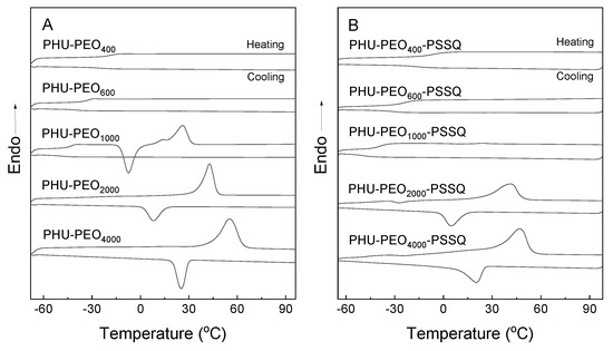 DSC curves of: (A) PHU-PEO multiblock copolymers; (B) PHU-PEO-PSSQ networks.