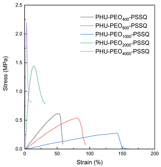 Stress–strain curves of PHU-PEO-PSSQ networks.