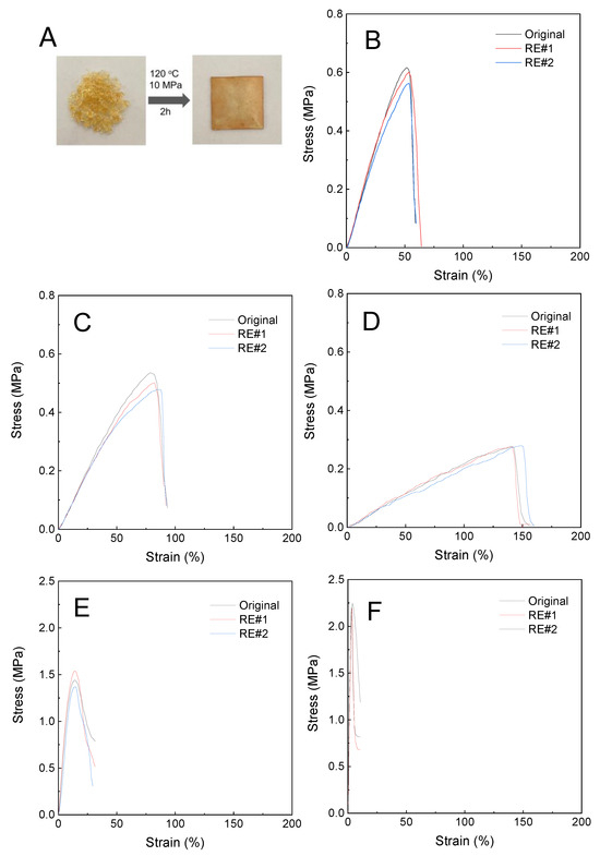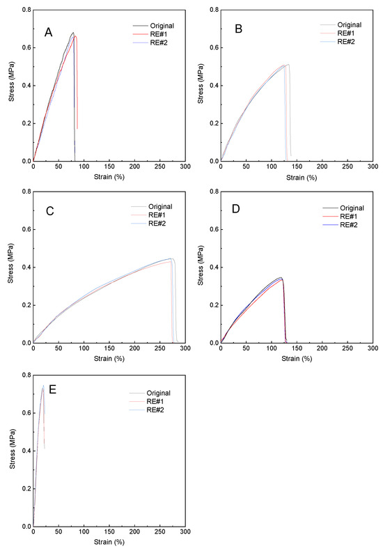 Stress–strain curves of: (A) PHU-PEO400-LiOTf, (B) PHU-PEO600-LiOTf, (C) PHU-PEO1000-LiOTf, (D) PHU-PEO2000-LiOTf and (E) PHU-PEO4000-LiOTf for reprocessing tests.