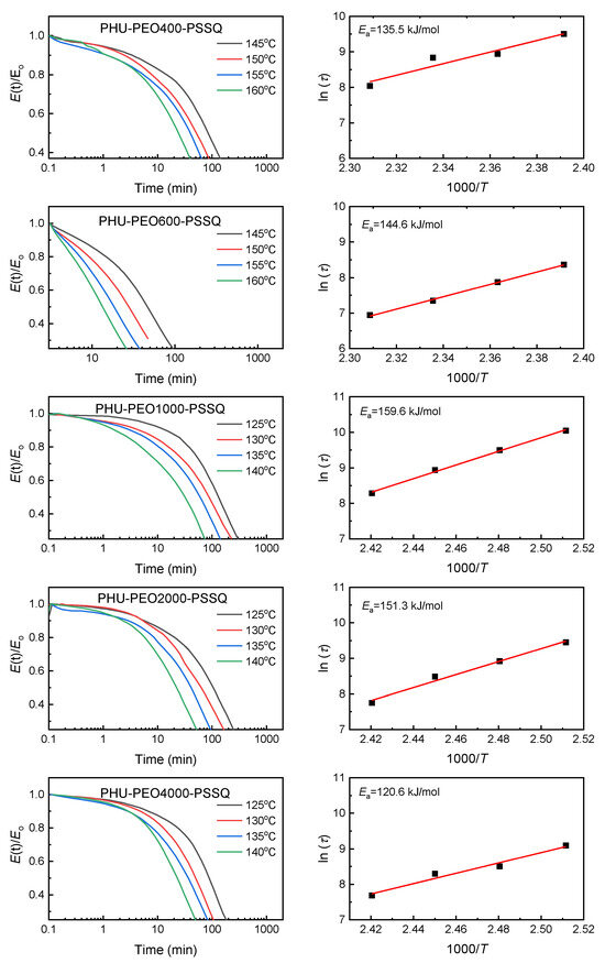 Stress relaxation curves of PHU-PEO-PSSQ networks: (Left) Stress relaxation curves; (right) plots of ln (τ) as functions of 1/T for the determination of apparent activation energy (Ea) values.