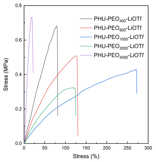 Stress–strain curves of PHU−PEO−LiOTf SPEs.
