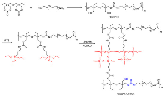 In this contribution, we reported a facile approach to obtain PHU networks via the post crosslinking of linear PHU-PEO multiblock copolymers. Toward this end, a series of linear polyhydroxyurethane (PHU) and poly(ethylene oxide) multiblock copolymers were first synthesized via the polyaddition of bis(6-membered cyclic carbonate) (B6CC) with α,ω-diamino-terminated poly(ethylene oxide) (NH2-PEO-NH2). The as-obtained PHU-PEO copolymers were then reacted with the 3-isocyanatopropyltriethoxysilane (IPTS) to afford the PHU-PEO multiblock copolymers bearing triethoxysilane pendent groups. Upon hydrolyzing and condensing, the PHU-PEO copolymers were crosslinked with PSSQ segments. It is anticipated that the crosslinking of PHU with inorganic segments (i.e., PSSQ) would significantly improve the thermomechanical properties of the PHU networks. Owing to the generation of PSSQ linkages, sily ether bonds were simultaneously introduced to the PHU networks. It has been realized that silyl ether bonds can be transformed into dynamic covalent bonds while Lewis acid (e.g., trifluoromethanesulfonate, Zn(OTf)2) was added to the system [46]. With the introduction of new dynamic covalent bonds, the reprocessing temperature of the PHU networks would be significantly decreased [46,47,48,49,50]. In addition, the PHU-PEO-PSSQ networks are readily formulated into solid polymer electrolytes (SPEs) by introducing lithium trifluoromethanesulfonate (LiOTf) [46,47,48,49]. It is proposed that the introduction of the hydrophobic PSSQ segments would diminish the impact of moisture absorption on the electric conductivity. The ionic conductivity can be modulated according to the PEO contents in the networks. Furthermore, the networks of SPEs are recyclable with the build-in of two motifs (i.e., hydroxyl urethane structural units and sily ether bonds). Such reprocessing properties are important for the recycling of SPEs. The purpose of this work is two-fold: (i) to report an approach to obtain PHU networks in a post-crosslinking fashion and (ii) to decrease the reprocessing temperature by introducing the metathesis of sily ether bonds.