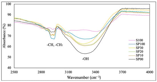 Figure 2. FTIR spectra of S100 and blend membranes in the range of 2500–4000 cm−1.