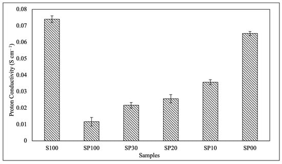 Figure 4 depicts the proton conductivity of the pure SPEEK membrane and the blend membranes. When comparing the proton conductivity of unmodified SPEEK to that of SP100, the incorporation of PVA into SPEEK significantly decreased the proton conductivity. This result is consistent with the findings of a previous study reported by Sahin, A [47]. The nonconductive PVA lacks proton-conducting groups, and its interaction with SPEEK reduced the amount of accessible sulfonic groups responsible for proton transfer in the membrane, hence decreasing proton conductivity [47,48]. However, the conductivity of the blend membranes improved progressively as the DMAc concentration decreased. This observed trend of proton conductivity corresponded to the results of the water uptake shown in Figure 3. Higher proton conductivity was seen in the blend membranes with greater water absorption, because the water molecules facilitated proton transport. As the DMAc concentration increased, the hydrogen bonding interaction between SPEEK and DMAc reduced the availability of free sulfonic acid groups for proton transport. Simultaneously, the interaction between PVA and DMAc decreased the membrane’s hydrophilicity and, consequently, the number of water molecules as proton carriers, resulting in a decline in proton conductivity [43].