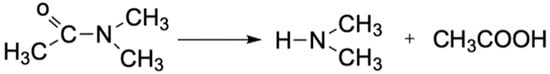 The compactness of the membrane structure was also enhanced by an acid–base interaction between acidic SPEEK and basic dimethylamine (DMA), where the basic DMA formed from the thermal decomposition of DMAc at elevated temperatures during membrane preparations, as illustrated in Figure 6. Acetic acid (CH3COOH) was also produced from the free –COCH3 groups during the partial decomposition of DMAc [46]. In the presence of acid and water, the decomposition of DMAc could happen even at room temperature. Consequently, as the solvent concentration increased, the greater acid–base interaction in the blend membrane increased its compactness, and this resulted in a decrease in methanol permeability, similar to the trend observed for methanol uptake.